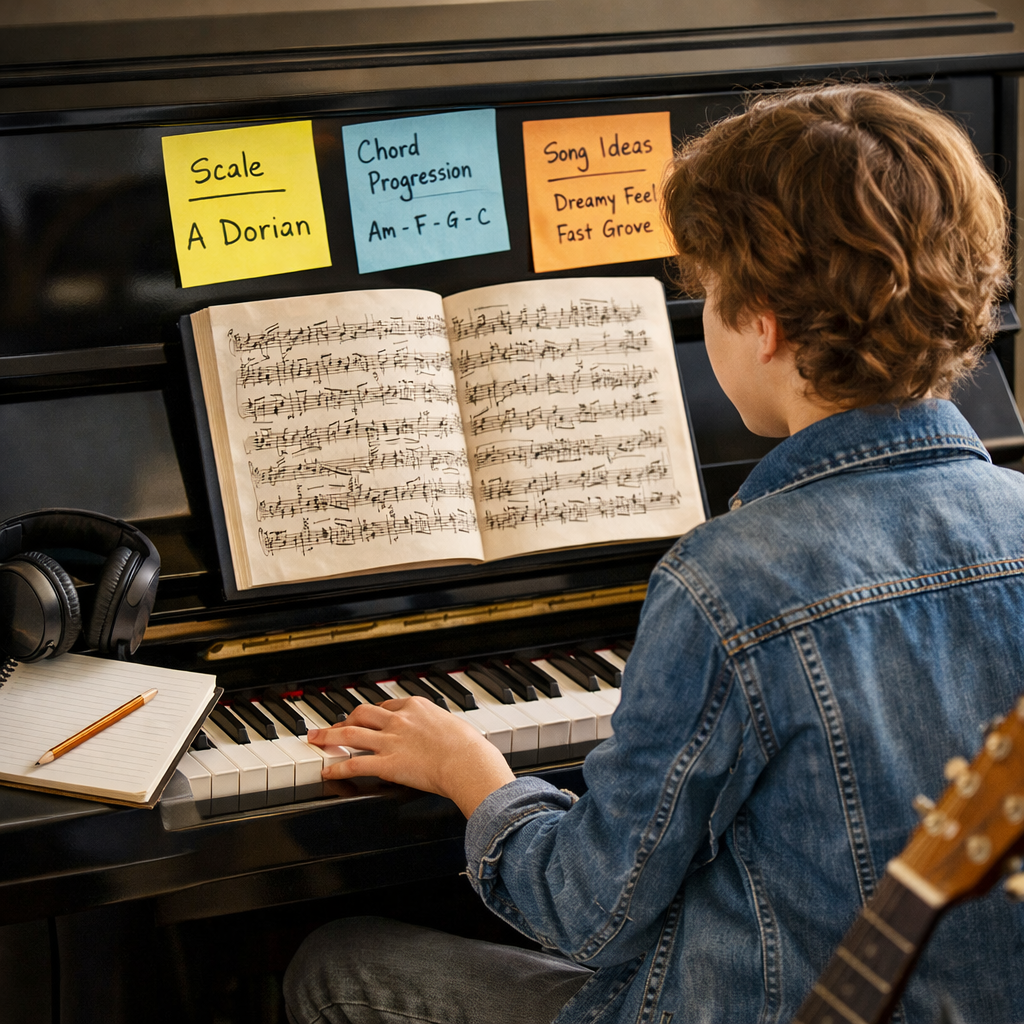 Students explore creativity at the piano by learning how to invent their own music. Lessons may include improvising melodies through the use of scales, building chord progressions, writing original pieces, and experimenting with musical ideas. This approach helps students understand how music works from the inside and encourages personal expression and creativity.